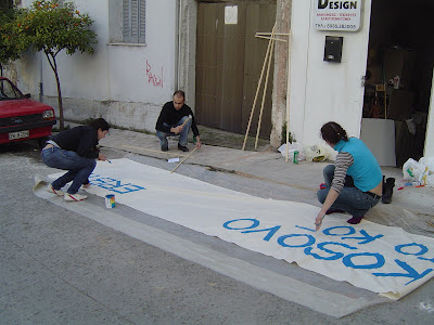 Η φωτογραφία είναι από τις εργασίες που προηγήθηκαν της πορείας διαμαρτυρίας, που διεξήγαγαν οι εν Ελλάδι Σέρβοι και φίλοι τους, διαμαρτυρόμενοι για τον διαμελισμό της πατρίδας τους και αντιδρώντας στην προοπτική περαιτέρω αποσταθεροποίησης.